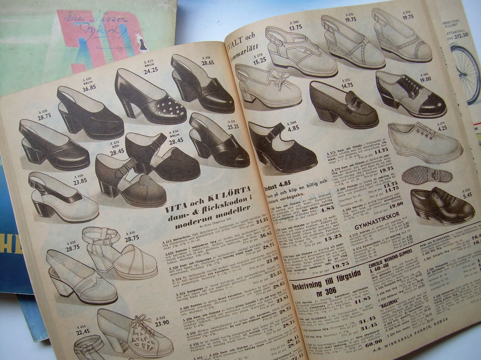 Bild tre visar slitstarka svenska sommarskodon från Åhlen & Holm så tidigt som 1935. Tennisskor 3,50kr och sandal med klack "Inger" 5,75 kr till damer. Grå gummisko i smärting 3,50 kr till herrar! I katalogregistret får man slå på "skodon" för att hitta rätt =).